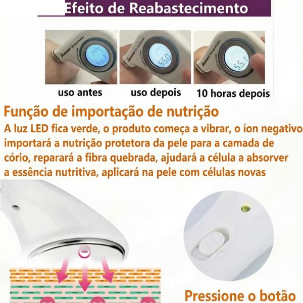 Funções: estimula circulação e colágeno, melhora firmeza e elasticidade, facilita absorção de cosméticos, reduz rugas e linhas finas